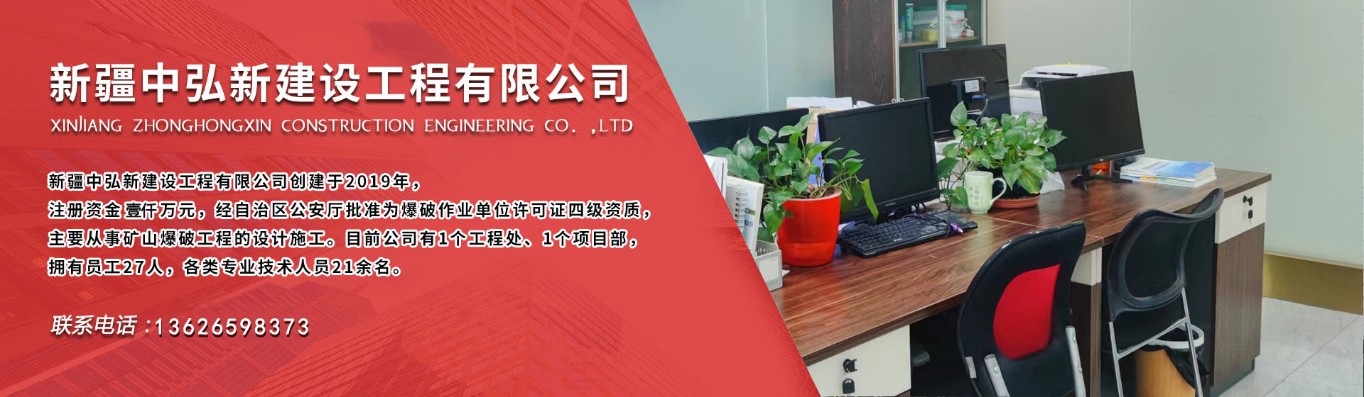 ZHONGHONGXIN CONSTRUCTION ENGINEERING   公 司 簡(jiǎn) 介新疆中弘新建設(shè)工程有限公司創(chuàng)建于2019年,注冊(cè)資金壹仟萬(wàn)元,經(jīng)自治區(qū)公安廳批準(zhǔn)為爆破作業(yè)單位許可證四級(jí)資質(zhì),主要從事礦山爆破工程的設(shè)計(jì)施工、礦上采掘施工業(yè)務(wù)。目前公司有1個(gè)工程處、2個(gè)項(xiàng)目部,分...